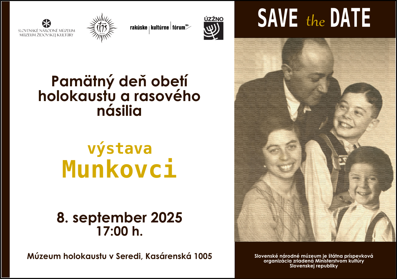SNM – MŽK – Múzeum holokaustu v Seredi Vás pri tejto príležitosti pozýva na koncert a otvorenie výstavy Munkovci. Podujatie sa uskutoční dňa 8. septembra 2025 o 17:00 hod. v spolupráci s Ústredným zväzom židovských náboženských obcí na Slovensku, Spoločnosťou Ježišovou – Rádom Jezuitov a Rakúskym kultúrnym fórom. Svojou účasťou ho poctia aj viacerí preživší holokaust.