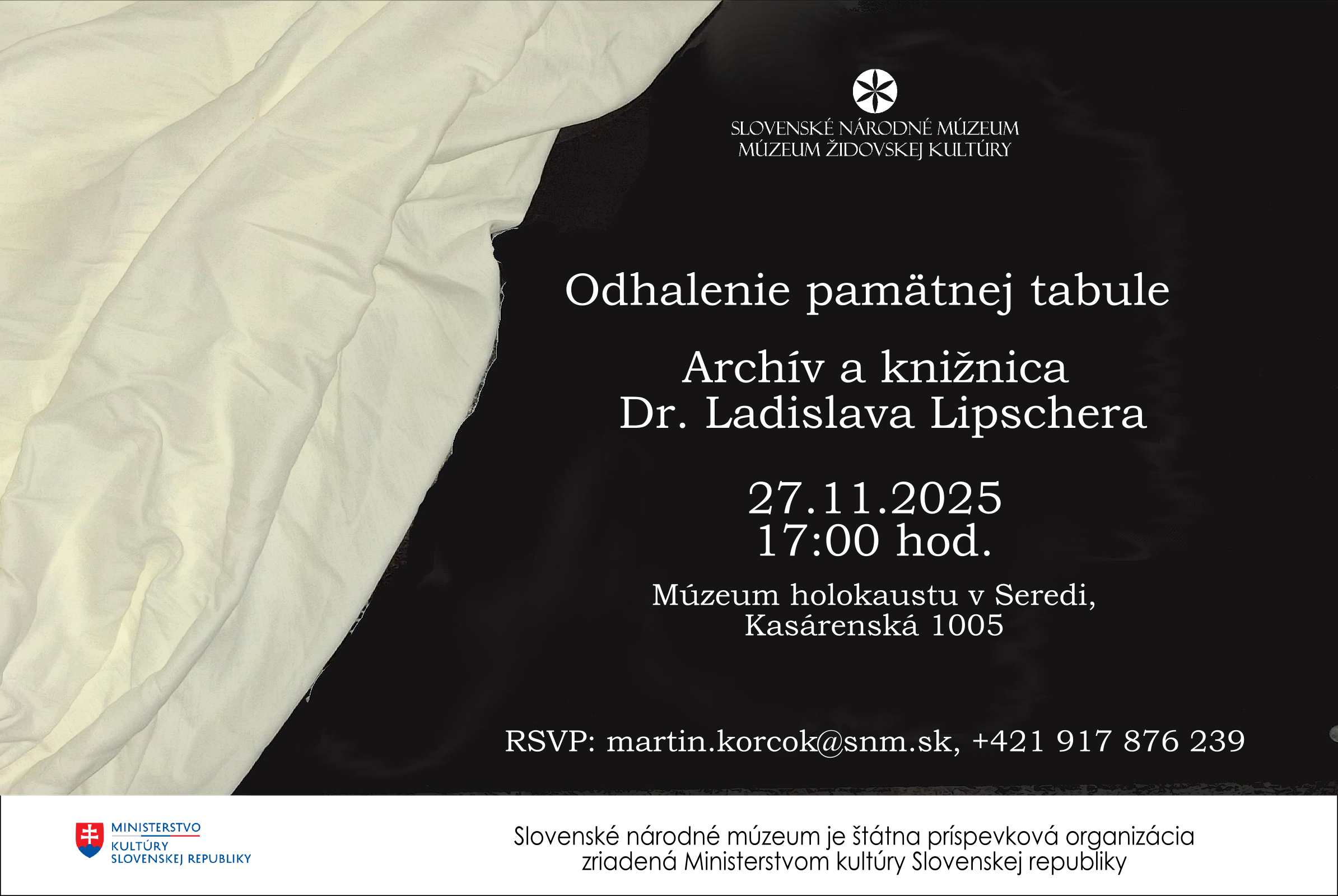 Pozývame Vás na odhalenie pamätnej tabule Dr. Ladislavovi Lipscherovi, ktorého meno budú niesť archív a knižnica SNM-MŽK-Múzea holokaustu v Seredi. Podujatie sa uskutoční dňa 27. novembra 2025 o 17:00 hod. v priestoroch Múzea holokaustu v Seredi.